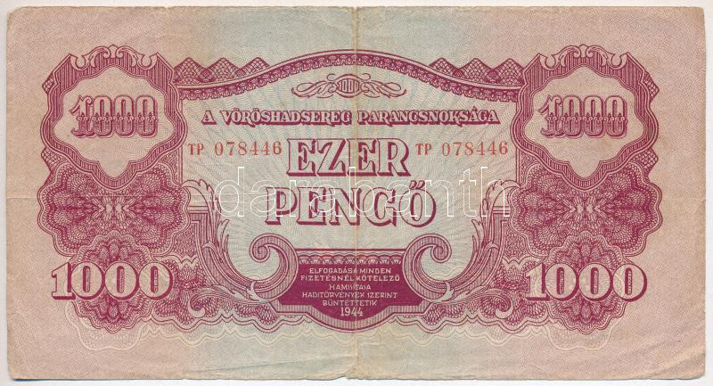 1944. 1000P "A Vöröshadsereg Parancsnoksága" "TP 078446... https://www.darabanth.com/de/451-Fernauktion/451.0/Numismatik/Ungarische-Banknoten~1500007/1944-1000P-A-Voroshadsereg-Parancsnoksaga-TP-078446-TF-VG-Adamo-P48~II2995215