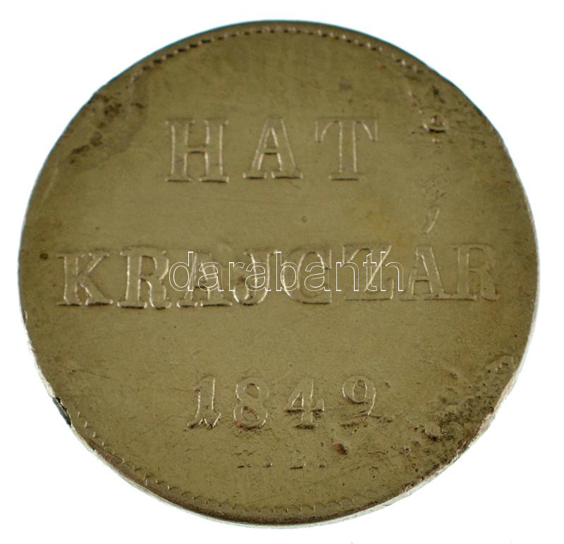 Adamo B3 https://www.darabanth.com/de/451-Fernauktion/451.0/Numismatik/Ungarische-Munzen-und-Munzen-mit-ungarischem-Munzzeichen~1500008/1849NB-6kr-Ag-TVF-ph-lapkahiba-Adamo-B3~II3001762