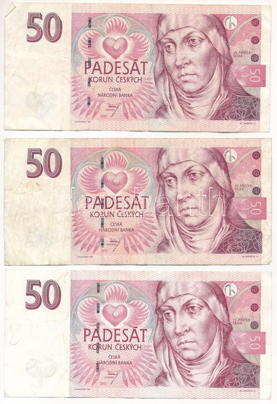 Czech Republic 1997. 50 Korun (3-x) C:F https://www.darabanth.com/de/451-Fernauktion/451.0/Numismatik/Weltweit-Banknoten~1500014/Csehorszag-1997-50K-3x-TF-Czech-Republic-1997-50-Korun-3-x-CF~II2999793