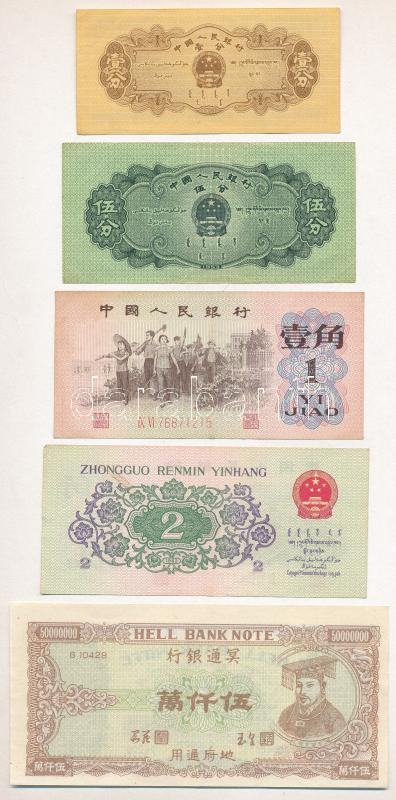 China 1953. 1 Fen + 5 Fen + 1962. 1 Jiao + 2 Jiao + ND 50.000.000 Hell Bank Note C:F