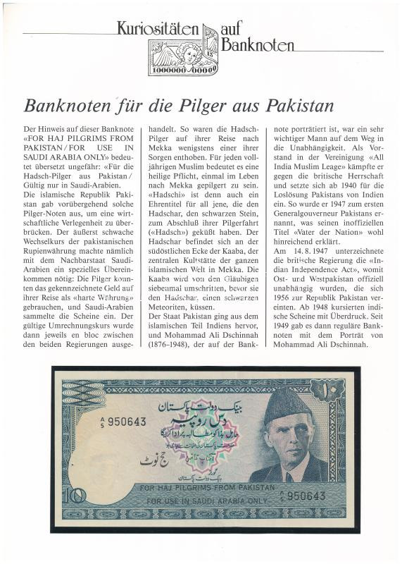Pakisztán DN (1982) 10R Hadzs-kiadás, német nyelvű "Kuriositäten auf Banknoten" tájékoztatólappal T:II tűlyuk Pakistan ND (1982) 10 Rupees Haj issue, with "Kuriositäten auf Banknoten" german language information sheet C:VF hole