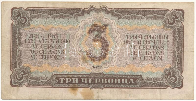 Szovjetunió 1937. 3Ch T:F beszakadás, fo. Soviet Union 1937. 3 Chervon... https://www.darabanth.com/de/451-Fernauktion/451.0/Numismatik/Weltweit-Banknoten~1500014/Szovjetunio-1937-3Ch-TF-beszakadas-fo-Soviet-Union-1937-3-Chervontsev-CF-tear-spotted-Kraus~II2919597