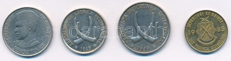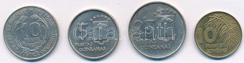 Egyenlítői-Guinea 1962. 10Fr Cu-Ni + 1969. 5p Cu-Ni + 25p Cu-Ni + 1985. 10Fr T:XF kis ph Equatorial Guines 1962. 10 Francs Cu-Ni + 1969. 5 Pesetas Cu-Ni + 25 Pesetas Cu-Ni + 1985. 10 Francs C:XF small edge error