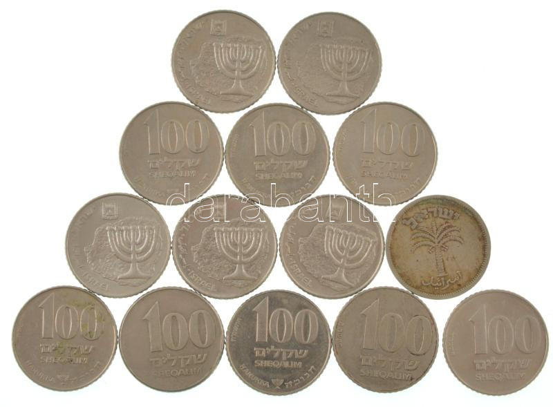 Izrael 1949. 100p Cu-Ni + 1984. 100Sh Cu-Ni (3x) + 1985. 100Sh Cu-Ni "Hanuka" forgalmi emlékérme (9x) + 100Sh Cu-Ni "Ze'ev Jabotinsky" T:XF,VF Israel 1949. 100 Pruta Cu-Ni + 1984. 100 Sheqalim Cu-Ni (3x) + 1985. 100 Sheqalim Cu-Ni "Hanukkah" circulating commemorative coin (9x) + 100 Sheqalim Cu-Ni "Ze'ev Jabotinsky" C:XF,VF