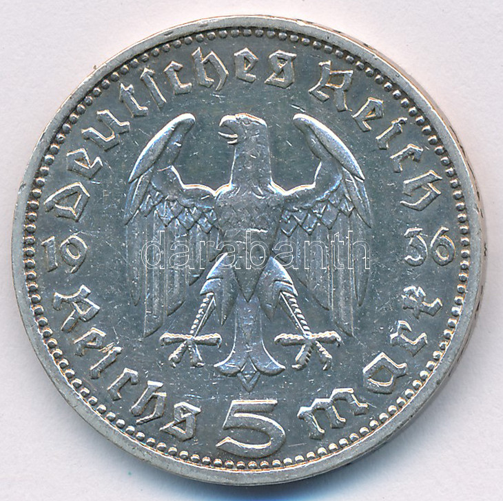 Német Harmadik Birodalom 1936D 5M Ag "Hindenburg" T:XF karc German Third Reich 1936D 5 Reichsmark Ag "Hindenburg" C:XF scratch Krause KM#86