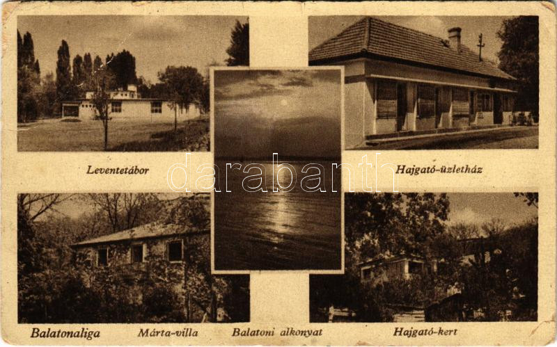 Beschreibung: 1943 Balatonaliga, Aliga (Balatonvilágos); Márta villa, Leventetábor, Balatoni alkonyat, Hajgató Dezső üzlete, kertje és saját kiadása (fa)