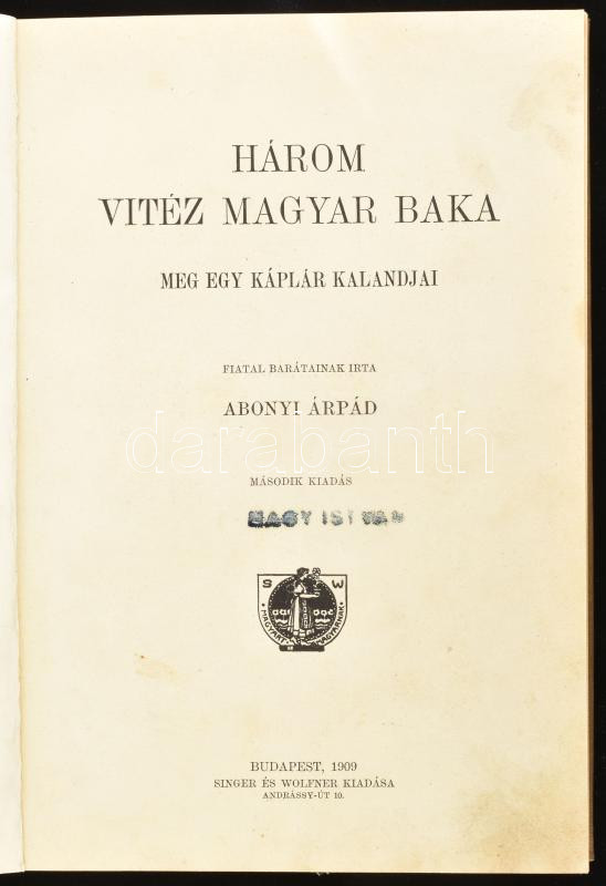 Abonyi Árpád: Három vitéz magyar baka meg egy káplár kalandjai. Fiatal barátainak írta - - . Bp., 1909, Singer és Wolfner, 20+(1) p. Második kiadás. Átkötött félvászon-kötésben, kopott borítóval, néhány lapon (kissé elmosódott) tulajdonosi névbélyegzővel, helyenként foltos lapokkal.