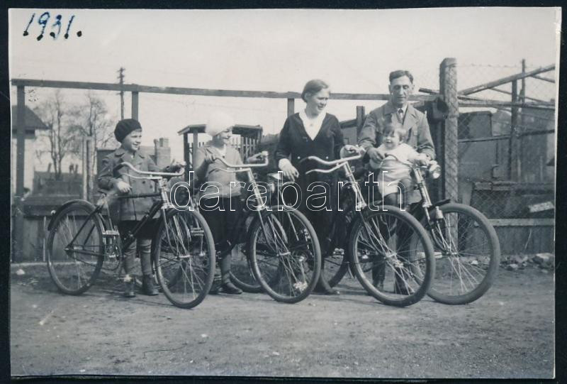 1931 Család kerékpárokkal, kartonra ragasztott fotó, 5,5×8 cm https://www.darabanth.com/de/452-Fernauktion/452.0/Fotografie/Foto~500024/1931-Csalad-kerekparokkal-kartonra-ragasztott-foto-5-5x8-cm~II3011285