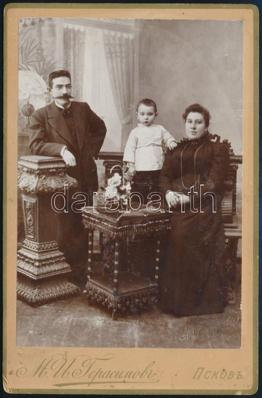 cca 1900-1910 Elegáns orosz polgári család, keményhátú kabinetfotó Geraszimov (Pszkov) műterméből, 16,5x10,5 cm / cca 1900-1910 Russian family, cabinet card from Atelier Gerasimov (Pskov), 16.5x10.5 cm