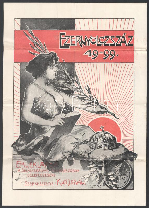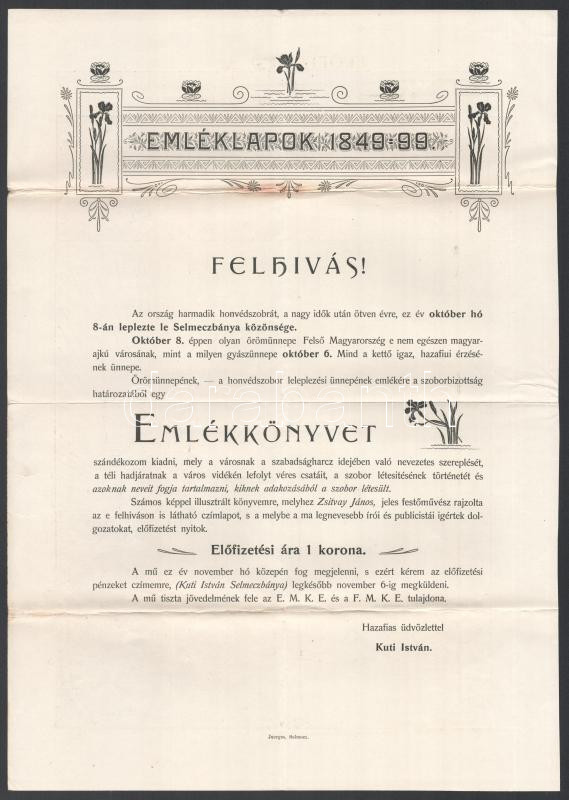 Beschreibung: 1899 Selmecbánya, az ország harmadik 1848-as szabadságharcra emlékező honvéd szobrának leleplezése alkalmából kiadott emlékkönyv reklám nyomtatványa