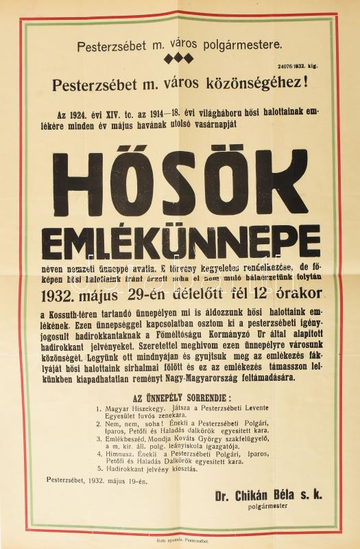 Beschreibung: 1932 Pesterzsébet m. város Hősök emlékünnepe az I. világháború áldozatai emlékére tartandó ünnepély plakátja, hajtva, jó állapotban, 48×32 cm