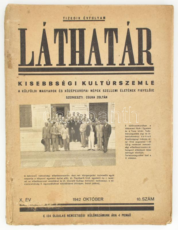 1942 Láthatár. Kisebbségi kultúrszemle. X. évfolyam 10. szám. Kiadói, ... https://www.darabanth.com/de/452-Fernauktion/452.0/Kunst-Dokumente-andere-Sammelgebiete/Drucksachen~1000014/1942-Lathatar-Kisebbsegi-kulturszemle-X-evfolyam-10-szam-Kiadoi-serult-papirkotesben-foltos~II3011150