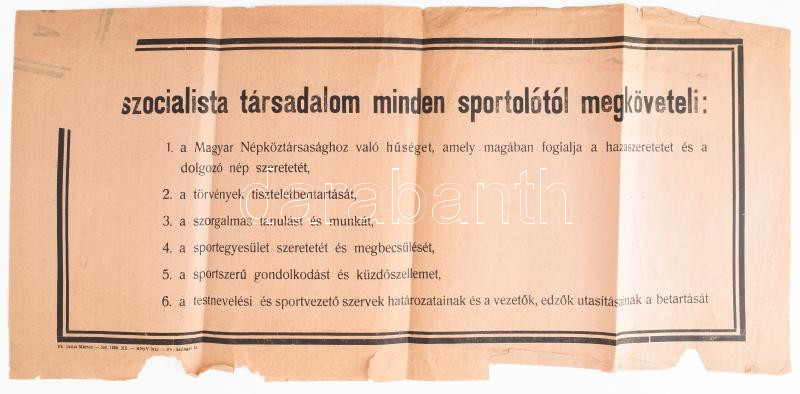 1959 "A szocialista társadalom minden sportolótól megköveteli..." falr... https://www.darabanth.com/de/452-Fernauktion/452.0/Kunst-Dokumente-andere-Sammelgebiete/Drucksachen~1000014/1959-A-szocialista-tarsadalom-minden-sportolotol-megkoveteli-falragasz-serult-hajtott-~II3012937
