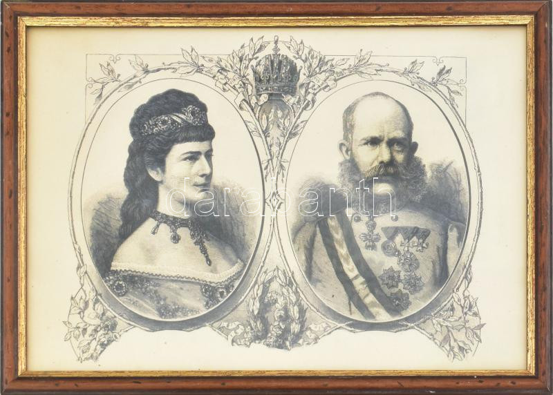 Beschreibung: cca 2000-2020 Erzsébet királyné (Sisi) és I. Ferenc József kitüntetésekkel. Modern nyomat, papír, jelzés nélkül. Üvegezett fakeretben, 21×30 cm