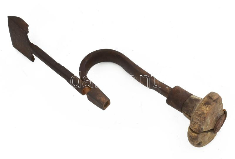 Beschreibung: Antik patkoló, patametsző szerszám, kovácsoltvas, "1895 BI" jelzéssel, sérült fa fogóval, h: 29 cm