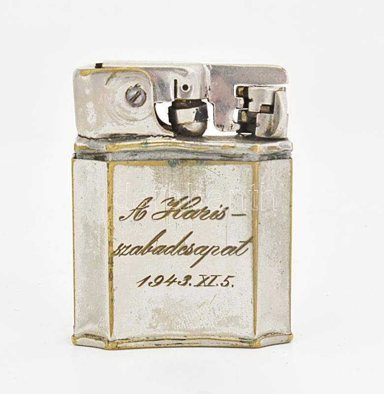 Mylflam benzines öngyújtó "A Haris szabadcsapat 1943. XI. 5. " gravíro... https://www.darabanth.com/de/452-Fernauktion/452.0/Kunst-Dokumente-andere-Sammelgebiete/Militaria~1000009/Mylflam-benzines-ongyujto-A-Haris-szabadcsapat-1943-XI-5-gravirozassal-5-cm~II3010827