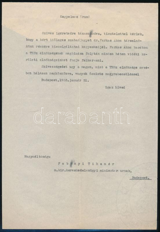 1933 Fabinyi Tihamér kereskedelemügyi miniszter autográf aláírással el... https://www.darabanth.com/de/452-Fernauktion/452.0/Kunst-Dokumente-andere-Sammelgebiete/Signatur~500023/1933-Fabinyi-Tihamer-kereskedelemugyi-miniszter-autograf-alairassal-ellatott-levele~II3009019