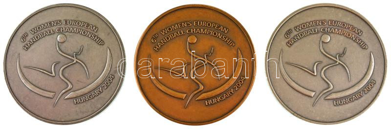 2004. "6. Női Kézilabda Európa Bajnokság" kétoldalas, ezüstpatinázott bronz emlékérem, feliratos, eredeti velúr zsebben (2x) (60mm) + "6. Női Kézilabda Európa Bajnokság" bronz emlékérem, feliratos, eredeti velúr (60mm) T:AU