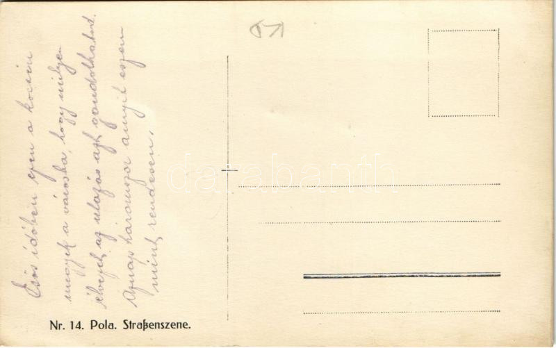 Beschreibung: 1915 Pola, Osztrák-magyar haditengerészet IV. Seebatailon postafogata, szamár kocsi / K.u.k. Kriegsmarine Matrose, Hü Salandra, Hü Sonnino - Nr. 14. Pola, Strassenszene / WWI Austro-Hungarian Navy mariner on post coach. photo