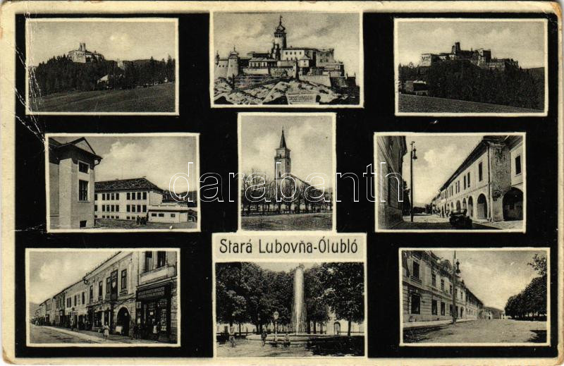 Ólubló, Ó-Lubló, Stará Lubovna; mozaiklap: Lublói vár ma és a 18. században, Római katolikus templom, Sétatér, szökőkút, Fő utca, üzletek, automobil. Bernát Blayer kiadása / multi-view postcard: the castle today and in the 18th century, Catholic church, promenade, fountain, main street, shops, automobile (Rb)