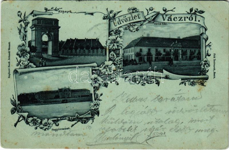Beschreibung: 1901 Vác, Kőkapu, fegyintézet, városháza, Art Nouveau, floral. Pick Testvérek kiadása (fl)