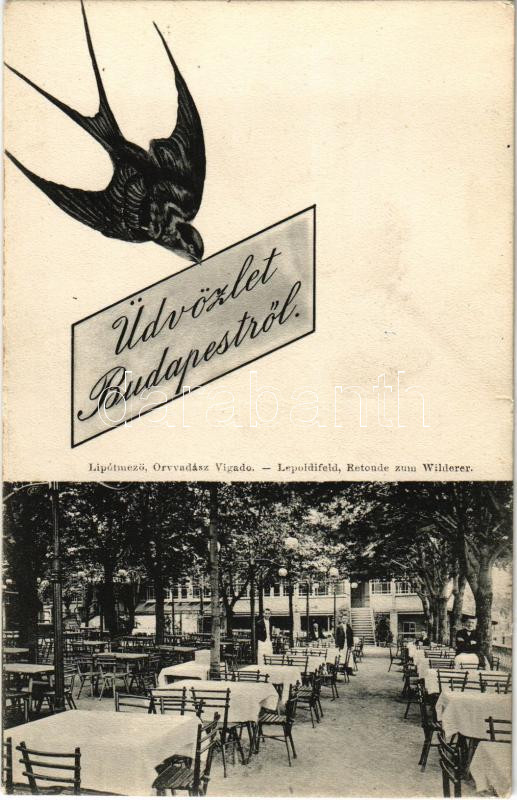 Budapest II. Lipótmező, Orvvadász Vigadó, étterem kerthelyisége, pincé... https://www.darabanth.com/de/453-Fernauktion/453.0/Ansichtskarten/Ungarn~1000004/Budapest-II-Lipotmezo-Orvvadasz-Vigado-etterem-kerthelyisege-pincerek-Udvozlo-montazs~II3015247