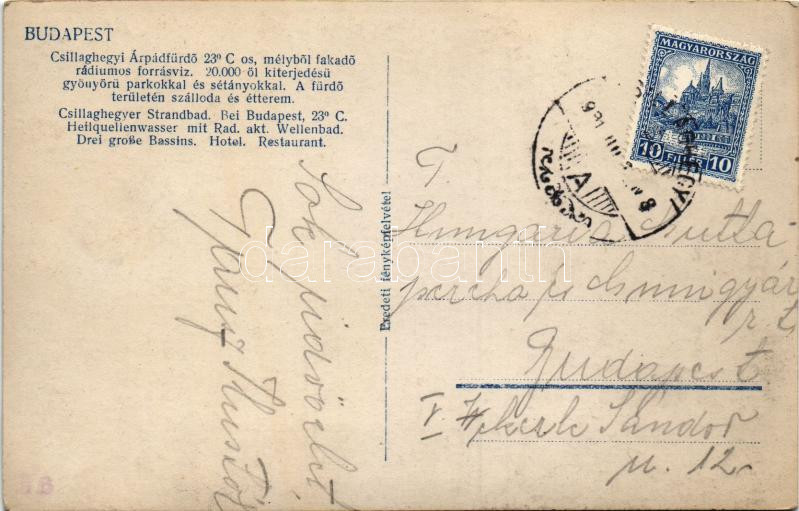 Budapest III. Csillaghegy Árpád strandfürdő, 23 fokos mélyből fakadó r... https://www.darabanth.com/de/453-Fernauktion/453.0/Ansichtskarten/Ungarn~1000004/Budapest-III-Csillaghegy-Arpad-strandfurdo-23-fokos-melybol-fakado-radiumos-forrasviz-photo~II3020775