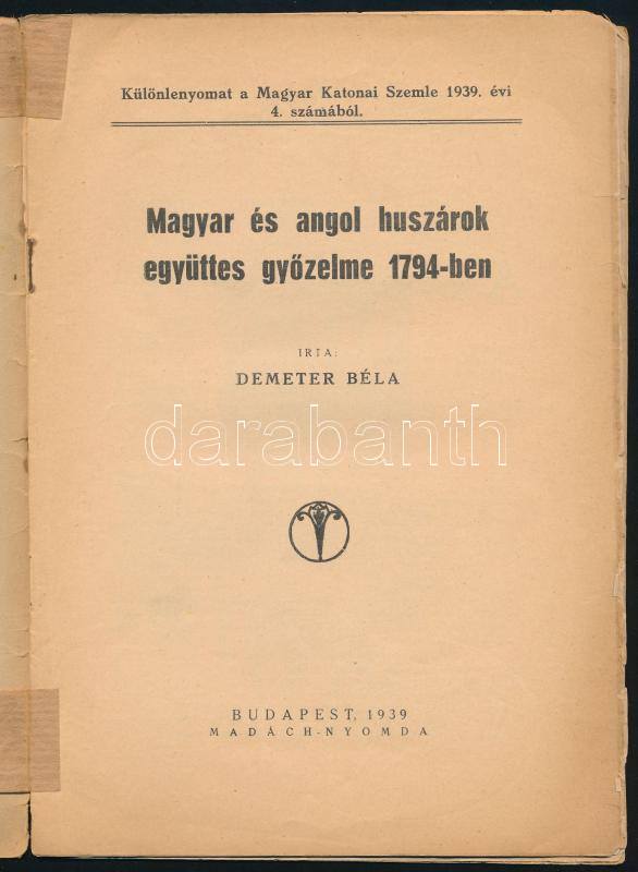 báró Szentkereszty Pál: Magyar és angol huszárok együttes győzelme 179... https://www.darabanth.com/de/453-Fernauktion/453.0/Bucher/Bucher-Militaria~1500020/baro-Szentkereszty-Pal-Magyar-es-angol-huszarok-egyuttes-gyozelme-1794-ben-Bp-1939-12plus4-p~II3015026