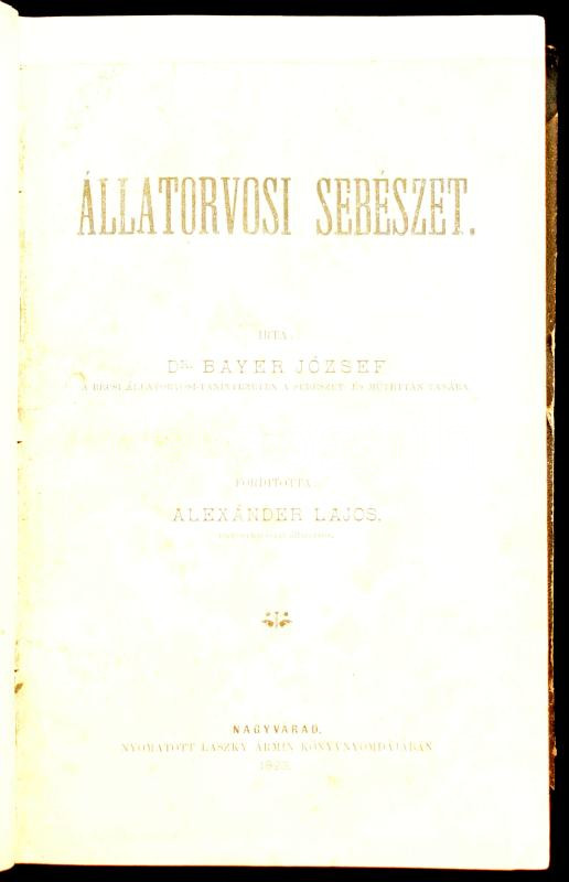 Forditotta Alexánder Lajos.Na... https://www.darabanth.com/de/453-Fernauktion/453.0/Bucher/Bucher-Naturwissenschaft-Medizin~1500024/Bayer-Jozsef-dr-Allatorvosi-sebeszetForditotta-Alexander-LajosNagyvarad-1893-Laszky-Armin~II3015367