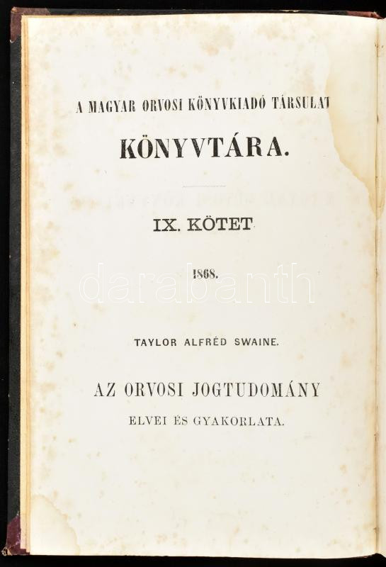 Taylor Alfréd Swaine: Az orvosi jogtudomány elvei és gyakorlata I. köt.: Orvosi tanúsítás, hulákra vonatkozó kérdések és mérgezés. Ford.: Balogh Kálmán. Pest, 1869, Magyar Orvosi Könyvkiadó Társulat,(Khór és Wein-ny.), VIII+557+1 p. Szövegközti fametszetekkel illusztrált. Korabeli félvászon-kötés, kopott borítóval, a gerincen kis sérüléssel, foltos lapokkal.