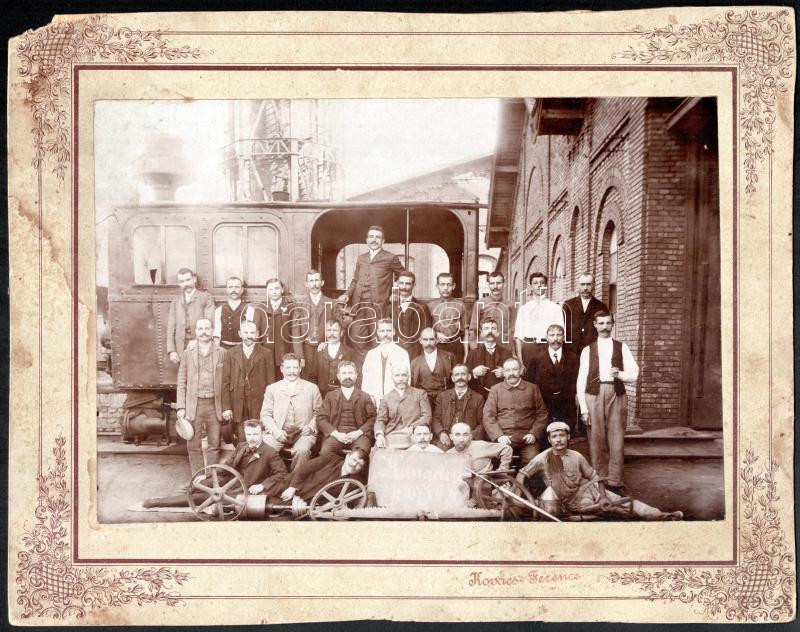 Beschreibung: 1907 Rákosplaota, Istvántelki Vasúti Főműhely (?), csoportkép, kartonra kasírozott fotó, karton sarka sérült, 16×23 cm