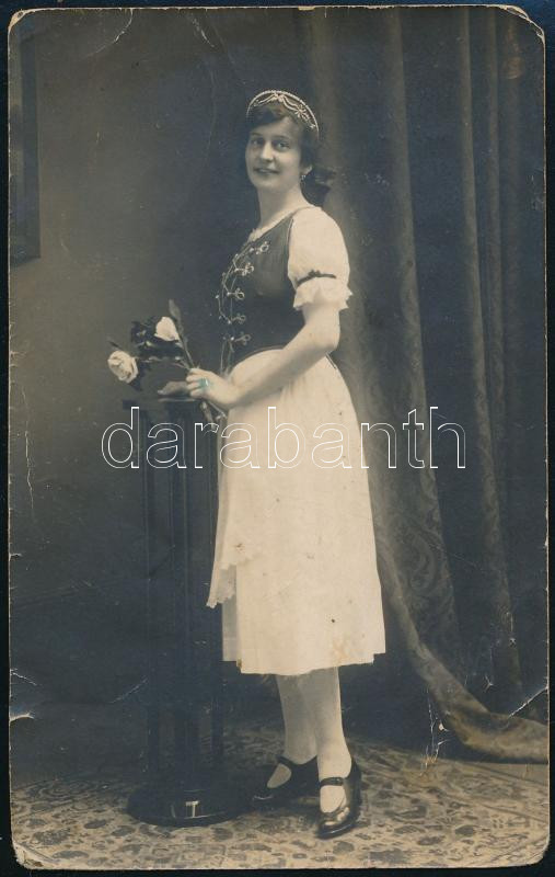 Beschreibung: 1921 Biharpüspöki (Nagyvárad, Erdély), fiatal hölgy magyaros ünnepi viseletben, fotólap, kissé sérült, hátoldala foltos, 13,5x8,5 cm