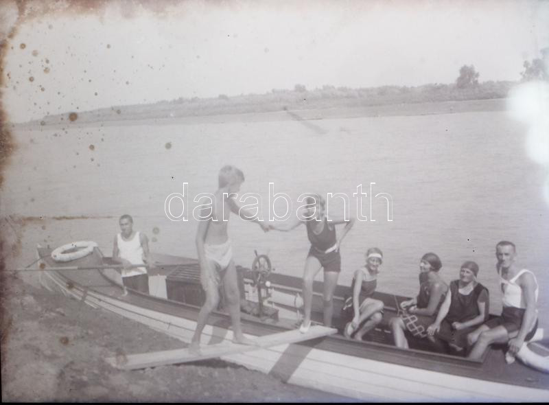 cca 1900-1920 Társaságok (kirándulók, csónakázók), elegáns lakásbelsők. 8 db nagyméretű üvegnegatív, 18x13 cm. Eredeti "Agfa-Chromo-Platten" dobozban (a doboz sérült).