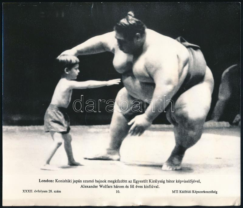 cca 1970-1980 "London: Konishiki japán szumó bajnok megküzdött az Egyesült Királyság bátor képviselőjével, Alexander Wolfars három és fél éves kisfiúval", MTI fotó, 24x21 cm