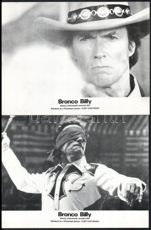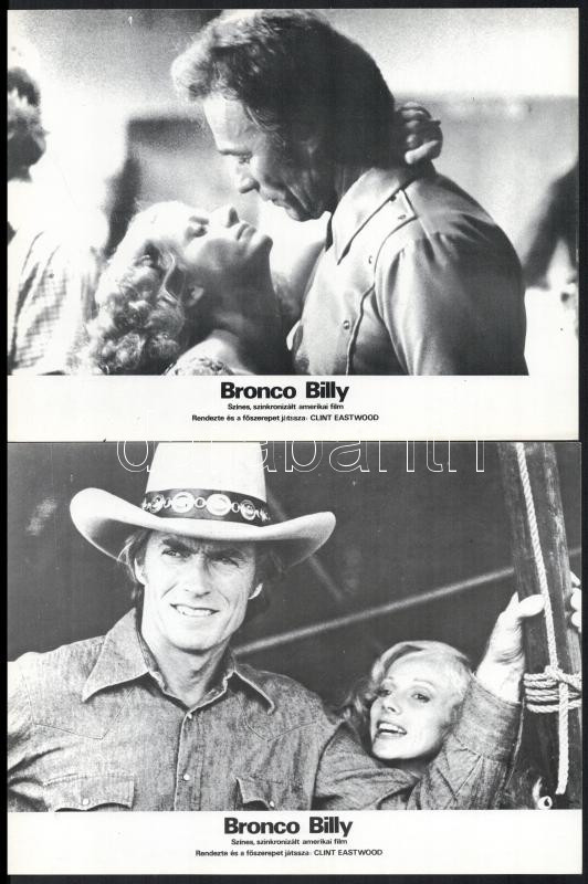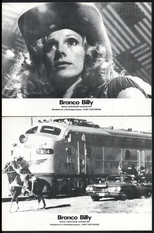 cca 1980 ,,Bronco Billy" című amerikai film jelenetei és szereplői, 9 db produkciós filmfotó nyomdatechnikával sokszorosítva kartonpapírra, egyoldalas nyomással, a használatból eredő (esetleges) kisebb hibákkal, 18x24 cm