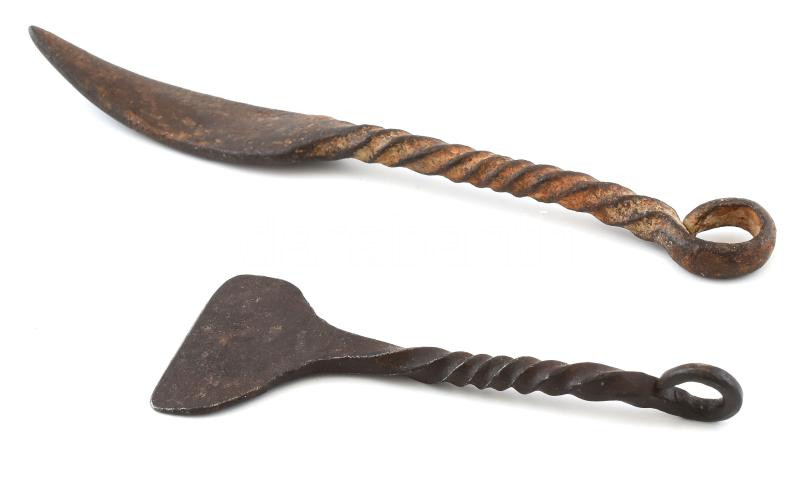 2 db kézzel kovácsoltvas sárvakaró XIX. sz. 12, 20 cm https://www.darabanth.com/de/453-Fernauktion/453.0/Kunst-Dokumente-andere-Sammelgebiete/Antik~500008/2-db-kezzel-kovacsoltvas-sarvakaro-XIX-sz-12-20-cm~II3019697