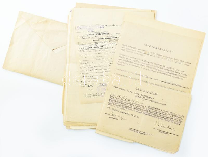 1953-1960 Győr, Verbőczy Kálmán (1888-1967) volt honvéd (al)ezredes, a Székely Hadosztály zászlóaljparancsnokának hivatalos iratai, az Állami Földmérési és Térképészeti Hivatal Győr-Sopronmegyei földmérési és földnyilvántartási felügyelőségénél való munkavállalásával kapcsolatosan. Munkaszerződések, jegyzőkönyv, nyugdíjazással kapcsolatos és egyéb iratok. Közte Verbőczy autográf aláírásával ellátott dokumentumok, valamint saját kezű feljegyzések.