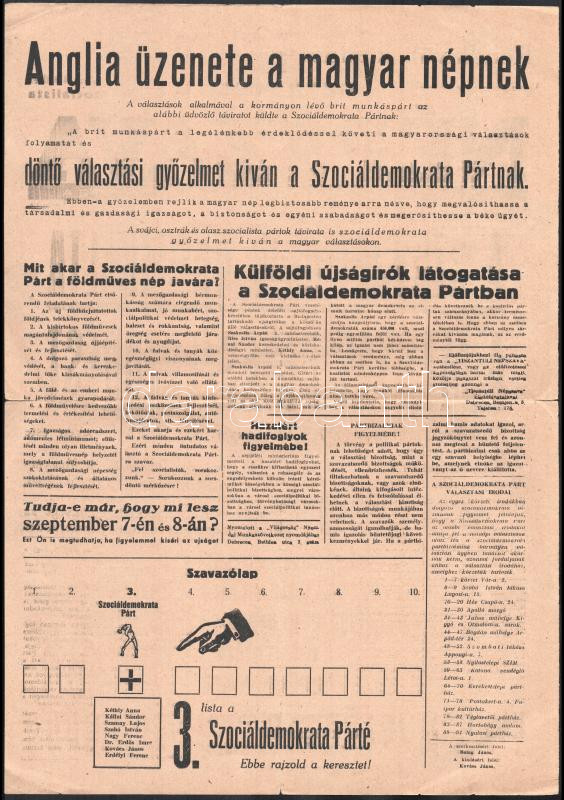 1947 Tiszántúli Népszava rendkívüli kiadás, 1947. aug. 30., a címlapon: "A Szovjet-Unió ratifikálta a magyar békeszerződést", a Szociáldemokrata Párt választási hirdetésével, 2 p.