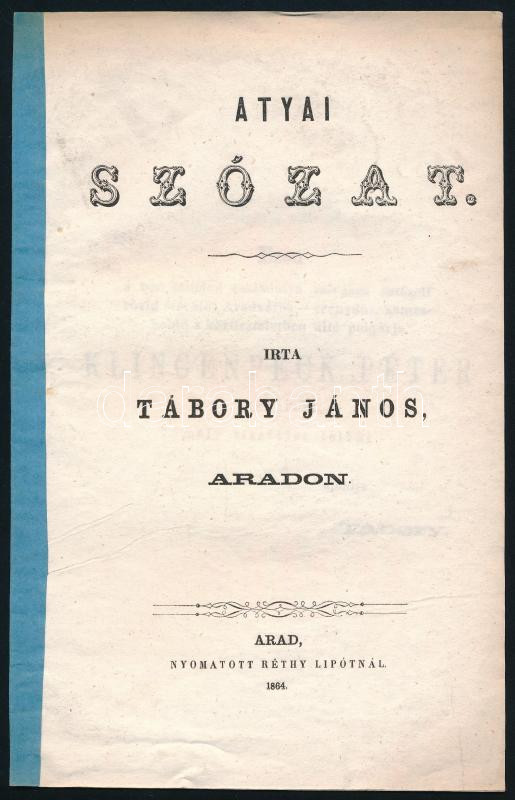 Tábory János: Atyai szózat. Arad, 1864. Réthy Lipót. fűzve, papírgerin... https://www.darabanth.com/de/453-Fernauktion/453.0/Kunst-Dokumente-andere-Sammelgebiete/Drucksachen~1500013/Tabory-Janos-Atyai-szozat-Arad-1864-Rethy-Lipot-fuzve-papirgerinccel-8p-Ritka~II3015860