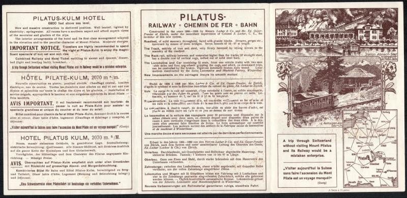 Beschreibung: cca 1900-1910 Pilatus-Bahn (Svájc), színes, litografált ismertető prospektus, angol, francia és német nyelven, kihajtva: 33,5x16