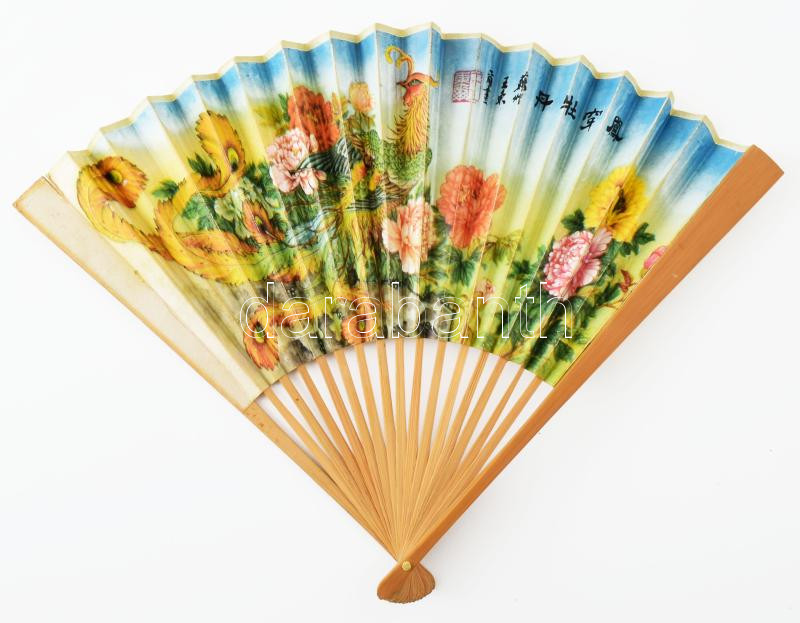 Távol-keleti stílusú modern legyező, fa-papír, nyomat illusztrációval,... https://www.darabanth.com/de/453-Fernauktion/453.0/Kunst-Dokumente-andere-Sammelgebiete/Flohmarkt~500014/Tavol-keleti-stilusu-modern-legyezo-fa-papir-nyomat-illusztracioval-kisse-serult-27x36-cm~II3021618