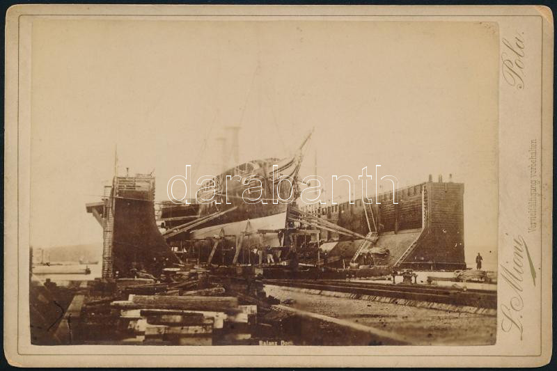 cca 1880 S.M.S. Miramar a szárazdokkban, Polában. Kabinetfoto Mioni műterméből / S.M.S. Miramar, viewed from the bow, is in dry dock.Cabinet photograph by L. Mioni, Pola,