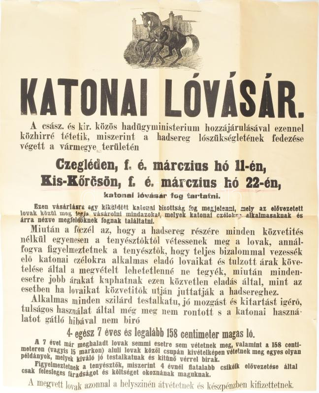 Beschreibung: cca 1888 Cegléd, katonai lóvásár hirdetmény, vágott, szakadásokkal, hajtott, 57×47 cm