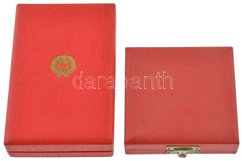 1965. "Szolgálati Érdemérem - A Haza Fegyveres Szolgálatában" 10 után zománcozott bronz kitüntetés mellszalagon + ~1965. "A belkereskedelem kiváló dolgozója" aranyozott, zománcozott jelvény festett miniatűrrel, tokban T:UNC,AU