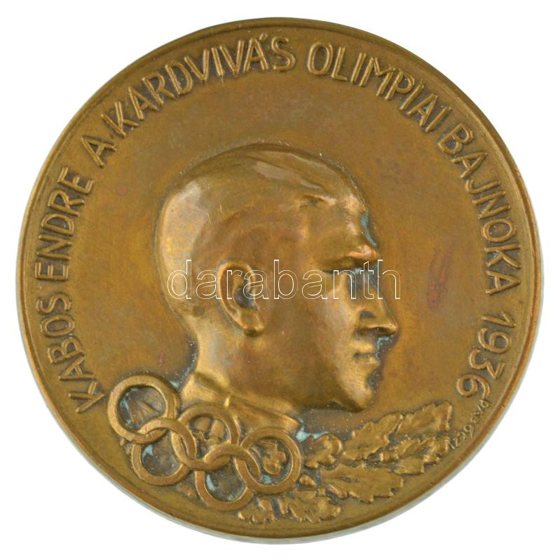 Dabóczi Mihály (1905-1980) 1936. "Kabos Endre a kardvívás Olimpiai Bajnoka 1936" bronz emlékérem hátoldalán "Ludvig BP" gyártói jelzéssel (49mm) T:AU kis patina