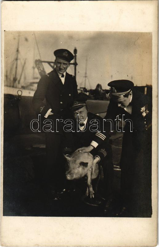 1915 SMS ORJEN Osztrák-magyar Haditengerészet Tátra osztályú romboló tisztjei Tónival a hajó disznójával, 85 kg-osan le lett vágva / K.u.K. Kriegsmarine Matrosen / Austro-Hungarian Navy destroyer SMS Orjen, officers with the ship's pig. photo (fl)