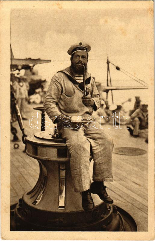1917 K.u.K. Kriegsmarine Matrose nach der Arbeit / SMS TEGETTHOFF osztrák-magyar matróz pipázik és sörözik a munka után / Austro-Hungarian Navy mariner smoking a pipe and drinking beer after working. Phot. A. Hauger 1916. Rotes Kreuz Nr. 1050. (EK)
