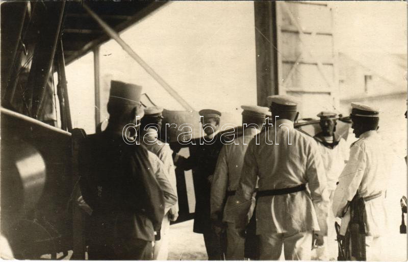 S.M. Karl auf der Inspicierung der Flugstation Catharina. K.u.K. Kriegsmarine / WWI Austro-Hungarian Navy, Charles I of Austria pays a visit to his navy fliers at the Naval Air Station on Santa Catarina Island, Pola. He is seen here inspecting an aircraft in a hangar on October 27, 1917, accompanied by several officers. photo (ragasztónyom / glue marks)