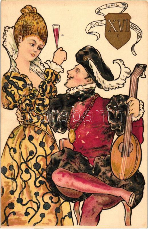 Beschreibung: Bor, Dal, Szerelem XVI. c. / Baroque couple, wine art postcard, litho