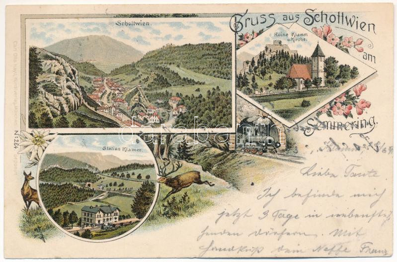 1897 (Vorläufer!!!) Schottwien, Station und Ruine Klamm, Kirche / railway station, locomotive, train, castle and church. Carl Otto Hayd No. 264. Art Nouveau, floral, litho